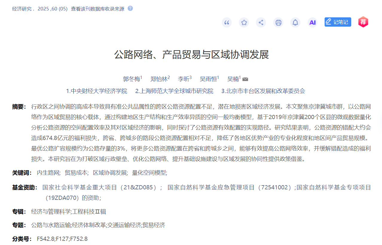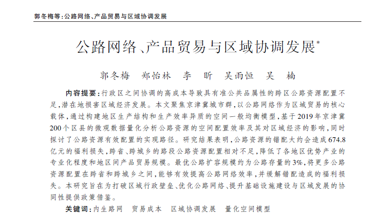 公司郭冬梅老师、吴楠老师和吴雨恒博士生与合作者的论文《公路网络、产品贸易与区域协调发展》在《经济研究》刊发