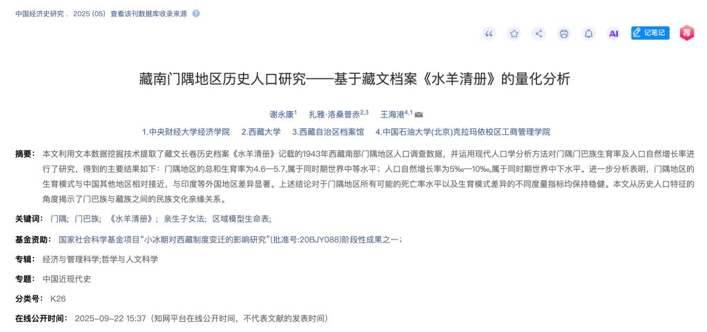 公司博士研究生谢永康和导师王海港、西藏档案馆扎雅的合作论文《藏南门隅地区历史人口研究——基于藏文档案〈水羊清册〉的量化分析》在《中国经济史研究》2025年第5期刊发。该文是对珍贵藏文长卷历史档案《水羊清册》(长366米、宽66厘米,由西藏传统手工旧藏纸拼接)研究的一大突破,由太阳成集团tyc151cc与西藏档案馆学者联合完成。该研究从历史人口特征揭示了门巴族与藏族之间的民族文化亲缘关系,为门隅地区属于中国的主权合法性提供了独特佐证。