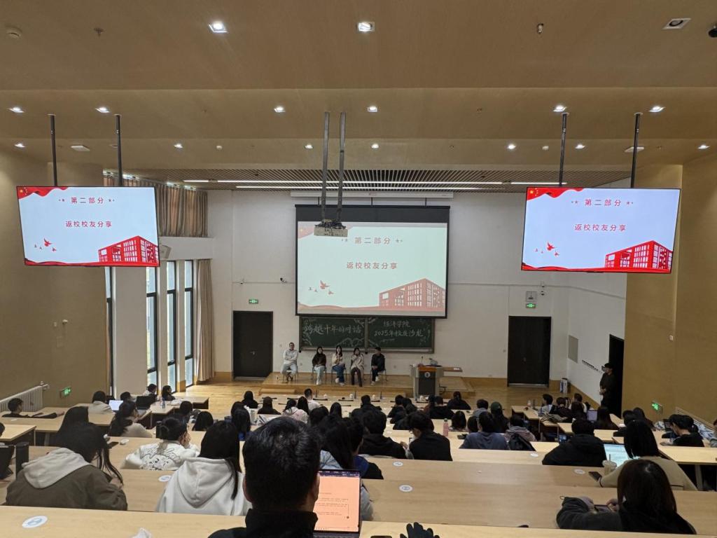 在随后的返校员工分享环节中,五位员工就毕业十年间所从事的行业领域、职业路径以及经验进行总结分享。他们来自不同的行业岗位,却都带着对母校的感激和对学弟学妹的关怀,坦诚分享了各自的奋斗故事与心路历程。互动环节中,同学们围绕职业规划、学业发展、能力提升等踊跃提问,员工们结合自身经验一一回应,建议同学们关注新兴领域,以行动专注当下、勇敢破局。
