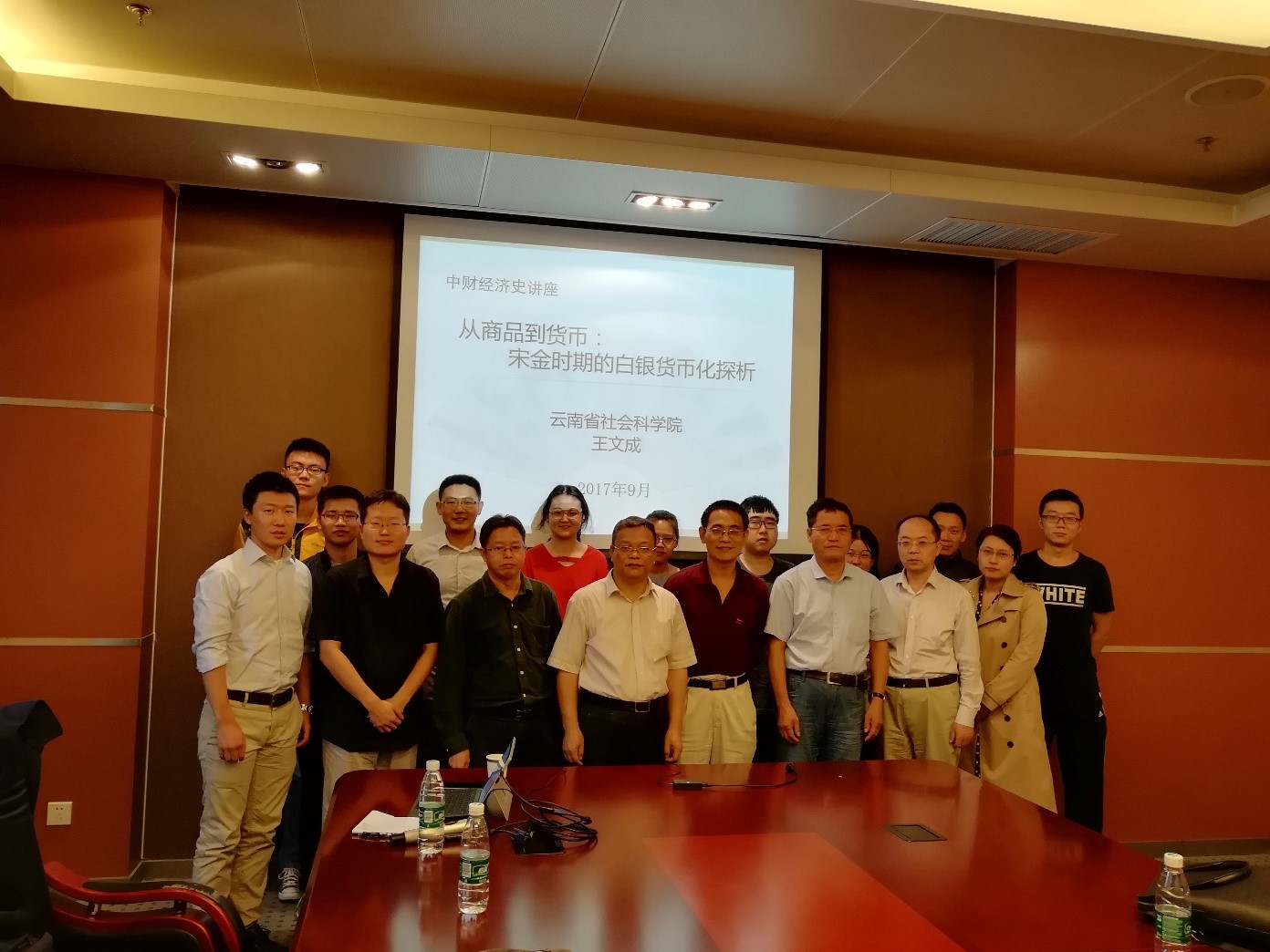 9月27日,应公司太阳成集团tyc151cc“中财太阳成集团tyc151cc名家讲座”的邀请,来自云南省社会科公司的王文成研究员公司为师生带来题为“从商品到货币:宋金时期白银货币化探析”的学术讲座。讲座由太阳成集团tyc151cc经济史系主任兰日旭教授主持,并邀请太阳成集团tyc151cc特聘教授魏明孔研究员对讲座进行了点评,太阳成集团tyc151cc包括冯春安、陈斌开、孙洪升、路乾、孙菁蔚、伏霖、金星晔等多位老师及员工参加了本次讲座。