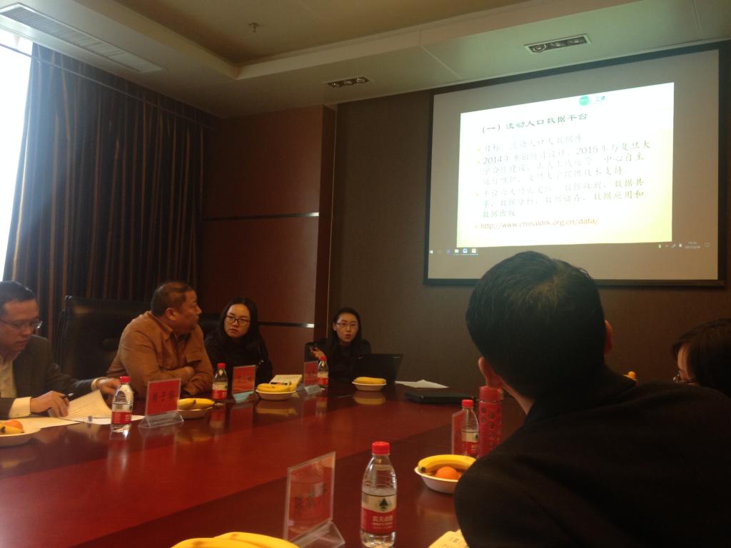 3月29日下午,国家卫生计生委流动人口服务中心肖子华主任和办公室副主任马长啸、健康服务部项目负责人王永进、信息处负责人陈晶和办公室干部林颖在学术会堂602与公司部分公司老师进行交流,会议由太阳成集团tyc151cc副经理陈斌开主持。