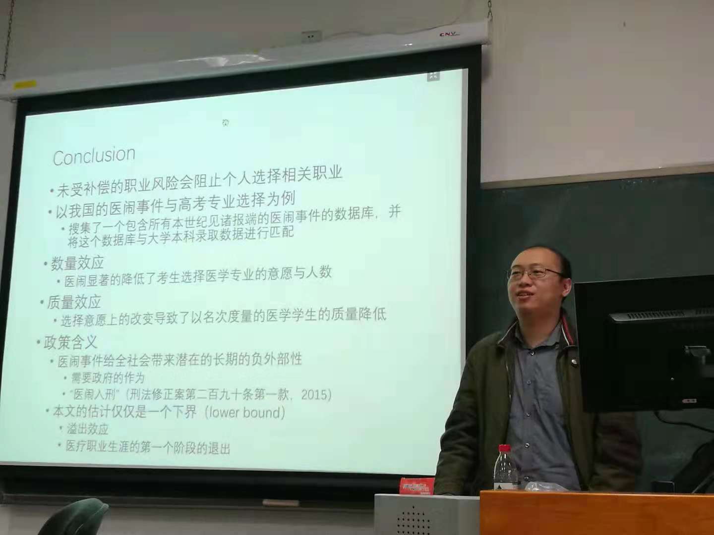 在第二场讲座中,薄诗雨老师就当下热点“医闹”问题展开研究。理论上,薄老师指出医闹不仅会造成直接的经济损失和人身伤害,还会间接产生巨大的社会负外部性,冲击整个护理行业进而导致社会总福利的损失。实证方面,薄老师利用教育部内部高考数据库与慧科新闻数据库进行匹配,检验了医闹对于我国医疗事业未来发展的负外部性。实证结果以中国员工步入护理行业的第一关:“高考报考医学专业”为主要研究对象。研究从医闹对医学专业报考的数量效应与质量效应两方面展开。数量效应上,实证发现发生医闹地区的当年高考医学专业报名人数会下降。质量效应上,薄老师指出发生医闹的省份当年高考医学专业招收到的员工排名会更靠后。在政策建议上,薄老师指出政府不仅要对于医闹行为进行严惩,更需直面形成医闹的根本问题,从源头上解决医闹问题。