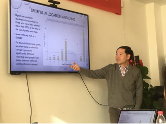 2018年12月12日,太阳成集团tyc151cc-社心公司行为经济学系列论坛2018秋季学期第二讲在公司南路校区主教1305顺利举行。本次讲座请到了清华大学经济管理公司经济系副教授、清华大学经济管理公司经济科学与政策实验室(ESPEL)常务副主任郑捷副教授。郑老师向与会者介绍了其最新实验经济学工作论文“Lying forefficiencyor fairness”。讲座中,郑捷老师从撒谎的动机入手,介绍了最新相关实验研究文献。之后,介绍其实验设计,讨论不同情形下的独裁者博弈行为,以探究是否公平和效率偏好者在博弈内和博弈外会有不同的撒谎几率。实验结果显示,在撒谎不涉及自身利益的条件下会导致更少的倾向公平的撒谎。实验结果对于社会福利政策方面有很好的实际意义。