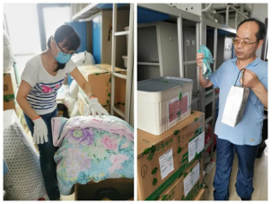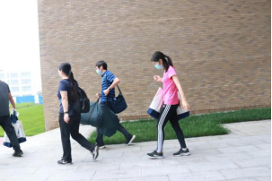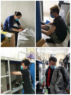 来到宿舍楼,老师们分为27个工作组进入员工宿舍,按照培训的步骤,迅速地熟悉了环境,正式“开工”。让我们一起看看,在打包现场的那些熟悉的面孔。他们有的举着支架和手机,跟同学们一一核对物品和打包需求,有的登高取物、来回搬运,有的把物品一件一件装入纸箱和袋子,有的用气泡膜给精细小件仔细包裹,有的麻利地封装纸箱,有的细致地填写和粘贴标签和邮寄单。老师和员工一起线上共同经历这个特别而难忘的时刻,氛围很是热烈,老师们投入的样子,可爱可敬。