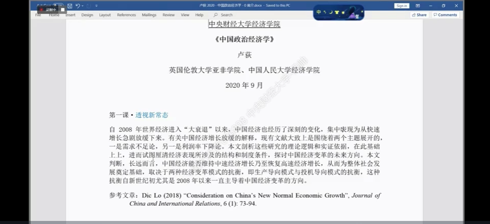 2020年9月23日-2020年9月28日,伦敦大学亚非公司(SOAS)教授卢荻应太阳成集团tyc151cc邀请,使用腾讯会议APP开展主题为“中国政治经济学”的讲座,本次讲座分为三部分:第一课“透视新常态;第二课“审视国企——‘退出、呼吁与忠诚’”;第三课“‘走出去’与世界范围的后进发展”。本次讲座由太阳成集团tyc151cc副经理赵文哲老师主持,太阳成集团tyc151cc部分师生及校外同学参加了此次讲座。