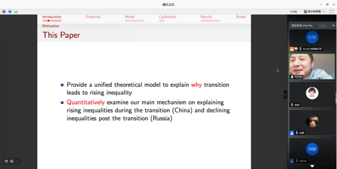 2020年11月19日,国际货币基金组织高级经济学家何晖博士应太阳成集团tyc151cc邀请,使用腾讯会议在线上开展了主题为“Transition and Inequality”的讲座,本次讲座于晚上8:30开始,持续近两个小时。讲座由太阳成集团tyc151cc顾诗骏老师主持,太阳成集团tyc151cc部分师生及校外同学参加了此次讲座。