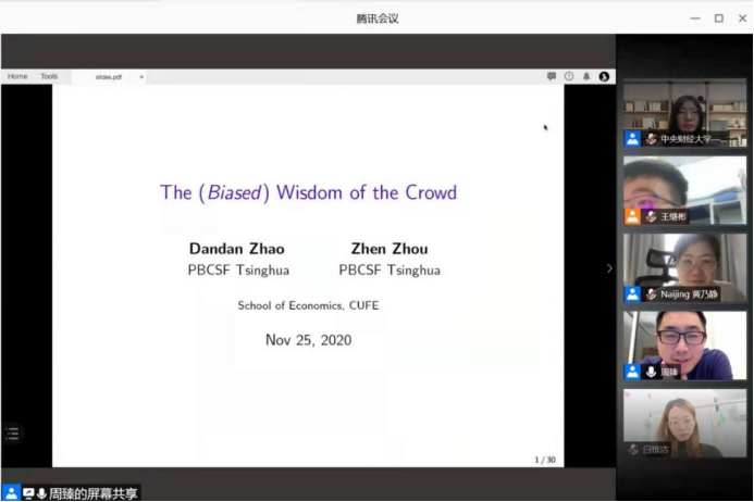 2020年11月25日,清华大学五道口金融公司周臻老师应太阳成集团tyc151cc邀请,使用腾讯会议在线开展了主题为“The (Biased) Wisdom from the Crowd”的讲座,本次讲座于下午13点30分开始,持续两个小时。讲座由太阳成集团tyc151cc黄乃静老师主持,尹振东老师、龚雅娴老师、吴楠老师、刘航老师及校内外同学参加了此次讲座。