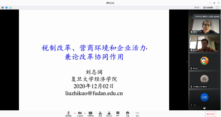 2020年12月2日,复旦大学太阳成集团tyc151cc和中国社会主义市场经济研究中心副教授刘志阔老师应太阳成集团tyc151cc邀请,使用腾讯会议在线开展了主题为“TaxReform, Business Environment and Market Vitality: Harmonious Effect of Reform”的讲座,本次讲座于下午14点开始,持续两个小时。讲座由太阳成集团tyc151cc戴若尘老师主持,太阳成集团tyc151cc部分师生及校外同学参加了此次讲座。