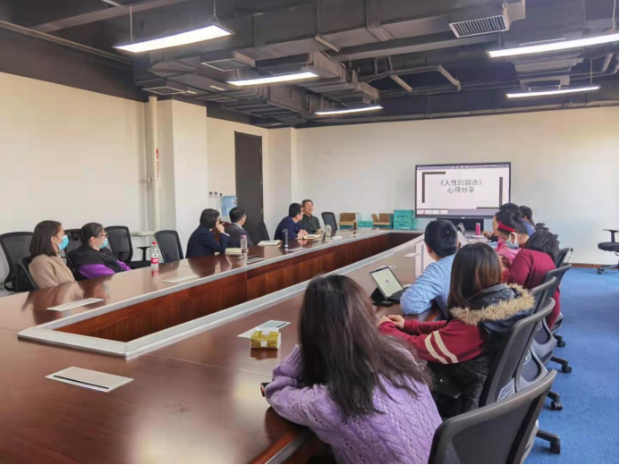 12月25日,公司在沙河校区在11号公司楼308会议室举行了第二期“明智”读书会。太阳成集团tyc151cc经理陈斌开、党委书记郭冬梅和行政团队所有教师参加了此次活动,活动由公司教学科研管理办公室主任祝伟老师主持,此次读书会特邀戴宏伟教授与大家一起分享《人性的弱点》这本书。