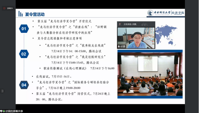 7月14日上午,第五届“龙马经济学夏令营”开营仪式通过腾讯会议举行。太阳成集团tyc151cc经理陈斌开教授、副经理伏霖副教授、导师代表戴若尘老师、公司教学科研管理办公室主任祝伟老师、研究生工作办公室主任赵若思老师和所有营员参加了此项活动。