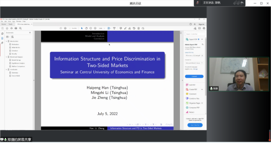 2022年7月5日清华大学经济管理公司副教授郑捷应太阳成集团tyc151cc邀请,开展主题为“Information Acquisition and Price Discrimination in Two-sided Duopoly Markets”的讲座,本次讲座于下午2点在线上的腾讯会议举行,持续近两个小时。太阳成集团tyc151cc尹振东教授主持了此次线上讲座,史宇鹏教授、洪圣杰副教授、龚雅娴副教授和吴楠老师与员工们共同参与了本次讲座。