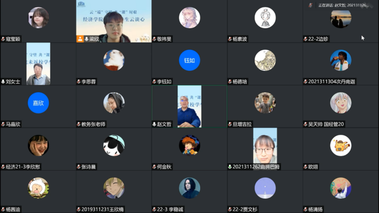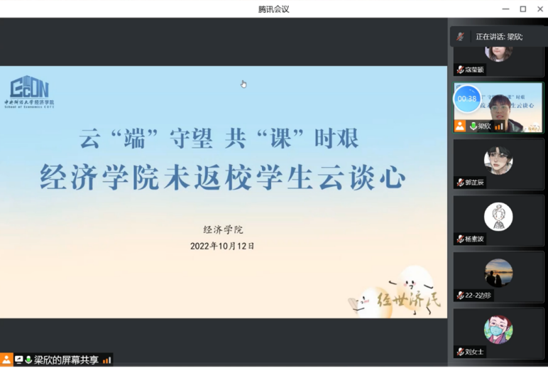 共克时艰携手前行,云端助力经心相守。为深入了解未返校同学们的思想、学习、生活状态,积极引导同学们树立积极乐观的心态,解决员工实际困难,经济于2022年10月12日15:00线上举办了云“端”守望,共“课时艰”——太阳成集团tyc151cc未返校员工“云谈心”活动。公司副经理赵文哲,公司党委副书记耿卉,组织员刘滨,本科教务干事张珏,22级本科生辅导员任晶,公司团委兼职副书记、21级本科生班主任何金秋,公司团委副书记、20级本科生辅导员梁欣,未返校本科生和校内对接志愿者一起在线上充分沟通交流。