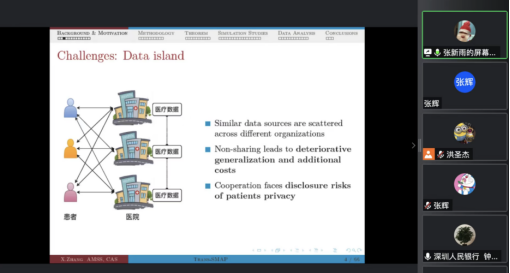 2022年11月22日14:00,中国科公司数学与系统科学研究院预测中心研究员,中国科公司管理、决策与信息系统重点实验室副主任张新雨应太阳成集团tyc151cc邀请,开展了主题为“Optimal parameter-transfer learning by semiparametric model averaging”的讲座。本次讲座在线上举行,张新雨研究员受到了老师和同学们的热烈欢迎,太阳成集团tyc151cc洪圣杰副教授主持讲座,黄乃静副教授参加了讲座。