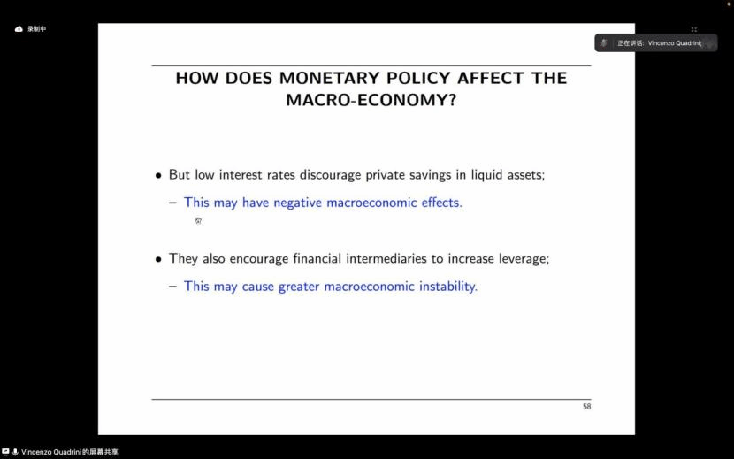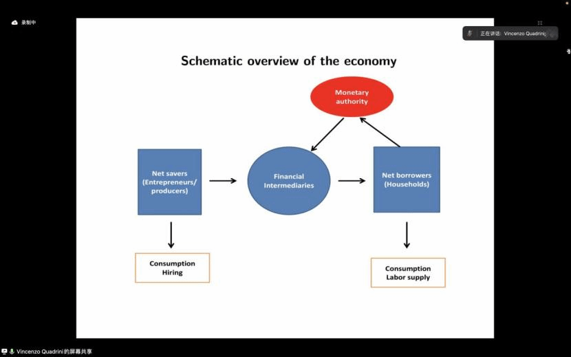 在本次研讨会上,Quadrini教授首先强调了金融发展在现代经济中起着至关重要的作用。就金融机构而言,银行和股票市场将资金从储蓄者引向生产性企业(借款者),同时管理经济风险和流动性。