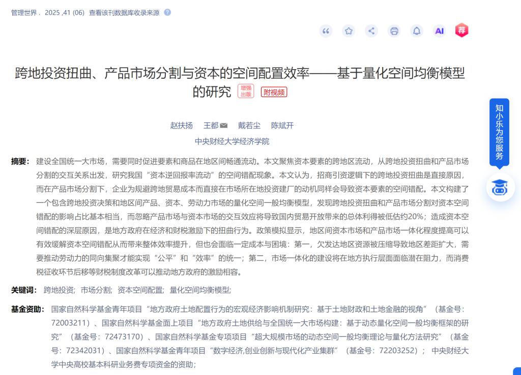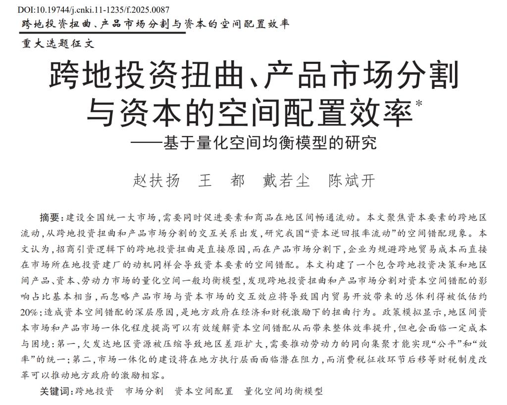公司赵扶扬老师、戴若尘老师、陈斌开老师和本科生王都的论文《跨地投资扭曲、产品市场分割与资本的空间配置效率——基于量化空间均衡模型的研究》在《管理世界》刊发