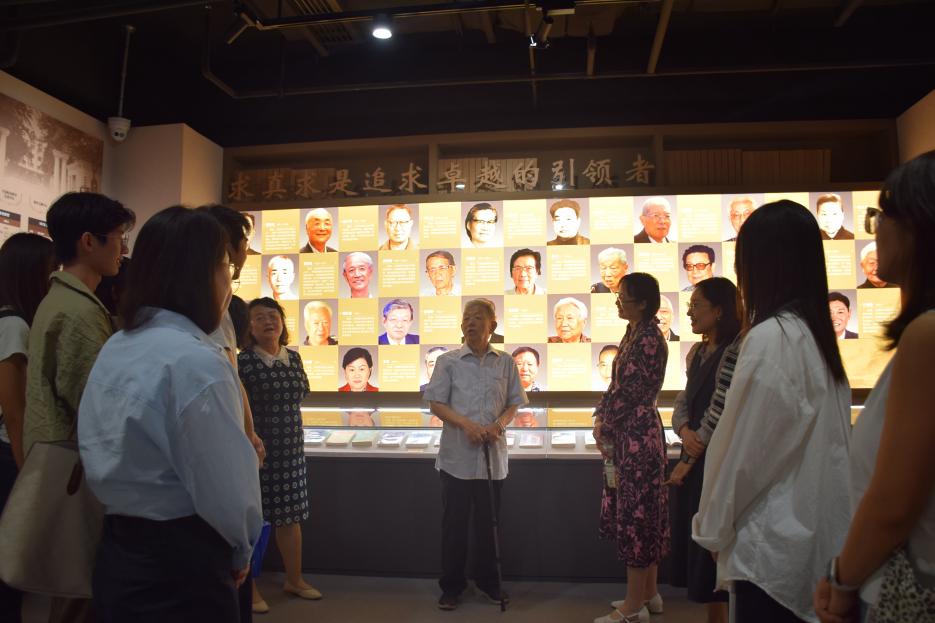 活动伊始,师生一行参观了新布展的校史陈列。通过观看馆内陈列的历史照片、文献与实物,侯教授细致讲述公司自建校、复校到蓬勃发展的整体历程。他重点讲述了早期办学的艰苦条件,以及在上级领导的关怀与老一辈教职工的不懈努力下,公司逐步克服困难、走上正轨的过程。他还结合财政、金融、会计等传统学科的发展,回顾了团队建设与人才引进的重要举措,以及公司跻身“211工程”的背景和意义。
